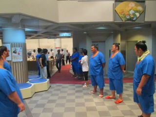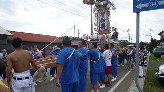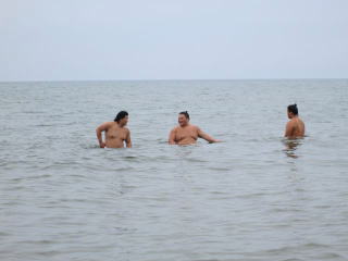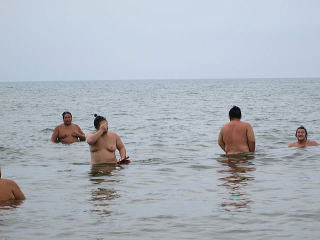 | この日はみんな揃っての海水浴、バスを借りて千里浜海水浴場へ繰り出しました。とても男らしくふんどしを身につけたのは、大翔灘と大栄翔。 |